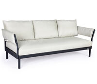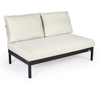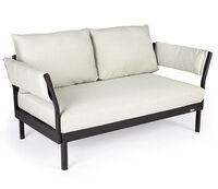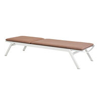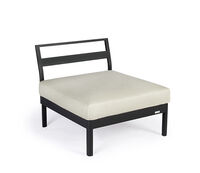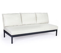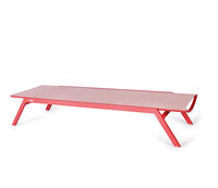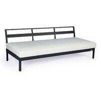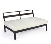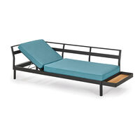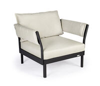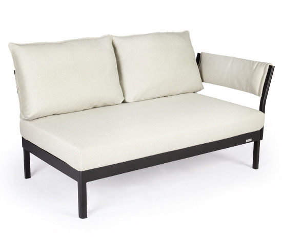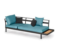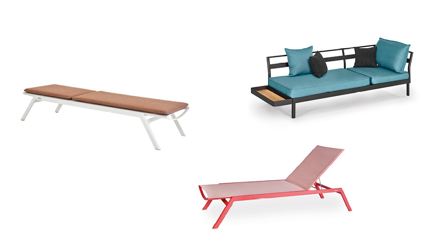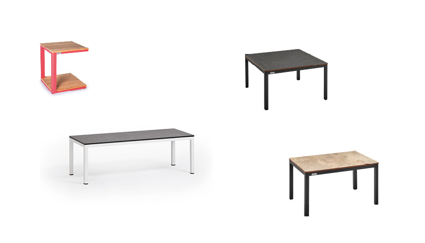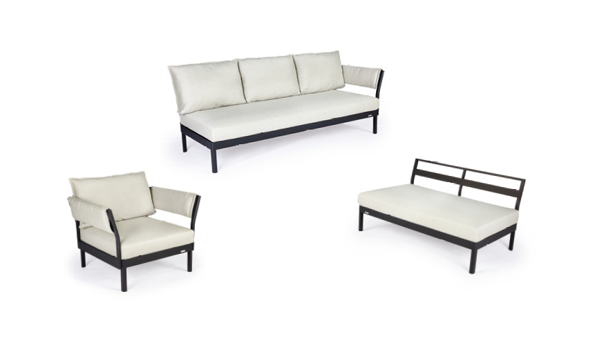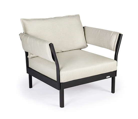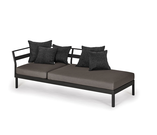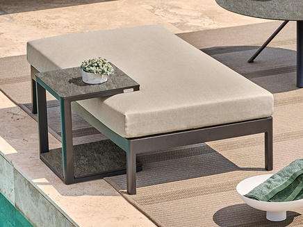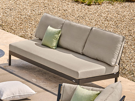One-, two- or three-piece upholstered elements form a modular system and can be mixed and matched as required. The frames are made from powder-coated aluminum. With or without armrests, the number of back cushions to suit your preference and desired level of comfort – the choice is yours. We offer the hook-on tray with an insert made of felt, teak wood or HPL, while tables in a variety of sizes and designs make the outdoor look just perfect. So join us and be creative!