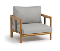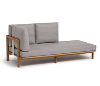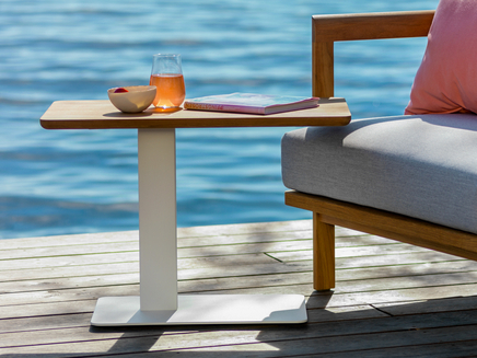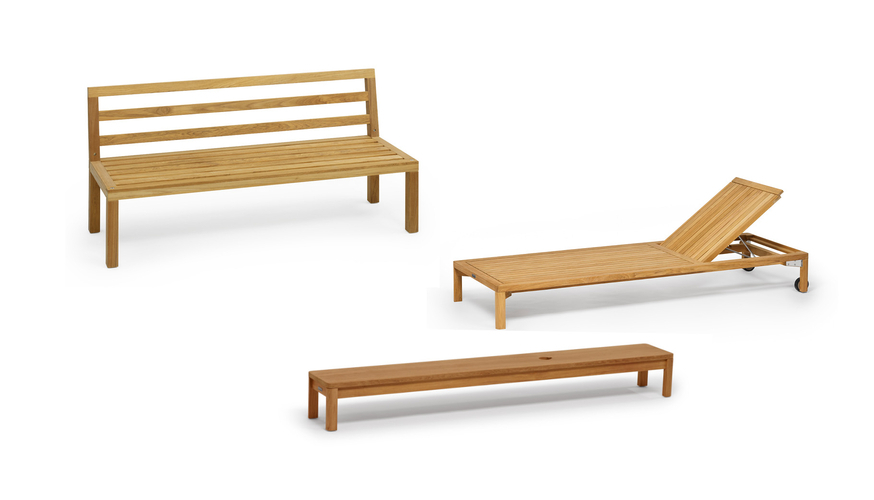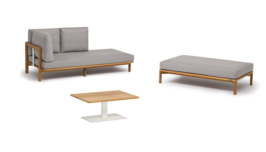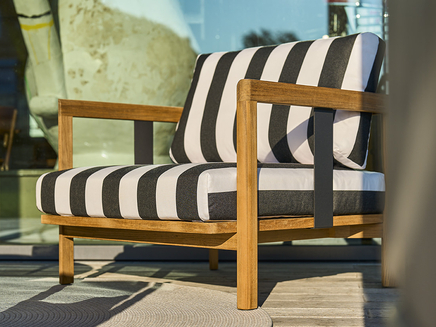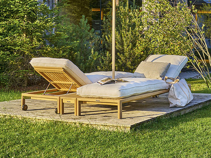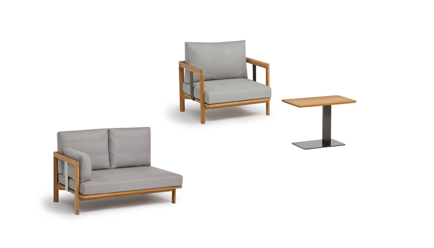 The Hamptons are synonymous with summer, sun and the American sense of style. That is why we named one of our furniture lines after them. NEW HAMPTON definitely has the potential to become a classic. Armchair and sofas are inviting and comfortable. So comfortable that they have long found their way into the living room. Their teak frames are augmented by powder-coated metal side panels in white, anthracite or stainless steel. We offer the armchairs and sofas in a variety of versions – with thick upholstery cushions which we cover with fabrics in a wide range of colours and qualities. And we also have matching footstools, side tables and a lounger with a long side table, inspiring dreams not only of Long Island beaches.