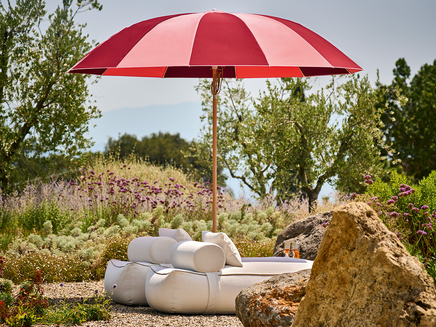 Of course, we designed our PAGODA PARASOL to provide protection against the sun, and we offer it with a pole made from powdercoated aluminum or lacquered hardwood. It comes in two different sizes. The covering is supported by fiberglass rods and hubs made from polyamide, and a pulley makes opening the parasol child’s play. And because versatility is our strong point, the smaller PAGODA PARASOL with a white frame is also available with a crank mechanism. Opening and tilting the parasol couldn’t be easier!