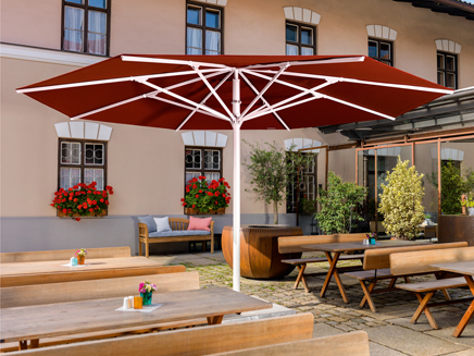 We have adapted it to the specific requirements of the hotel and restaurant industry. Although our TELESCOPIC PARASOL is a real giant, it can be closed simply and easily without tables or benches beneath it getting in the way.